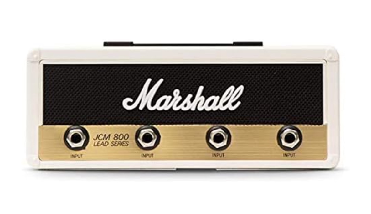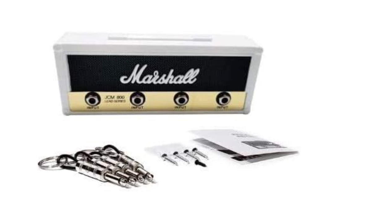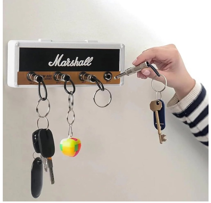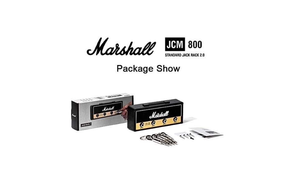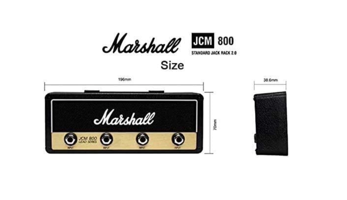 Nástenný držiak na kľúče značky Marshall s dizajnom gitarového zosilňovača JCM800. Držiak obsahuje materiály použité pri výrobe skutočného gitarového zosilňovača. Vybavený je 4 držiakmi na kľúče – jack konektory a montážnu sadu s príslušenstvom.